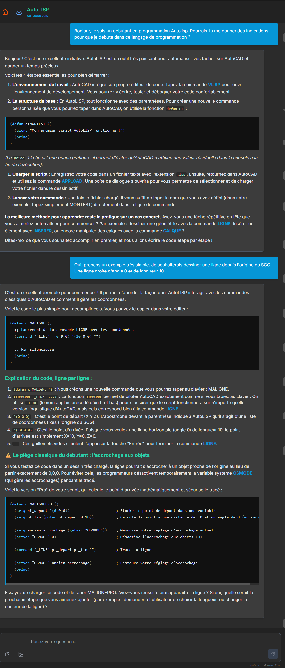 Je m’inscris en faux contre ceci, car si l’intelligence artificielle permet de soumettre des problèmes complexes et de les résoudre, autrement dit de créer et de débuguer des programmes AutoLISP par exemple, il peut aussi permettre à un débutant d’apprendre l’AutoLISP de la même façon qu’il permet d’apprendre une langue. Et c’est un tout autre aspect de l’intelligence artificielle qui me paraît presque aussi important.
