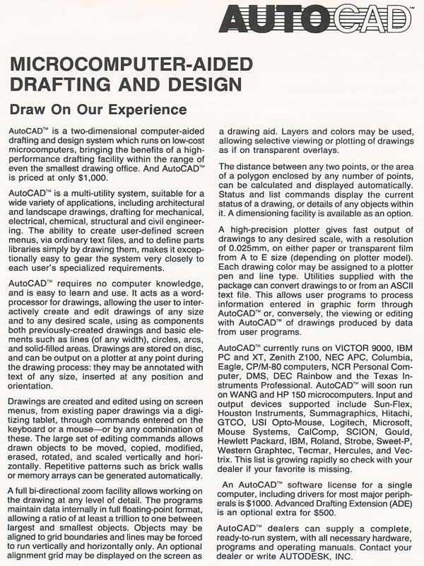 AutoCAD®™ est un système de dessin et de conception assistés par ordinateur bidimensionnel qui fonctionne sur des micro-ordinateurs à faible coût, offrant les avantages d’une installation de dessin haute performance à la portée même du plus petit bureau de dessin. Et AutoCAD®™ est proposé à seulement 1 000 $.