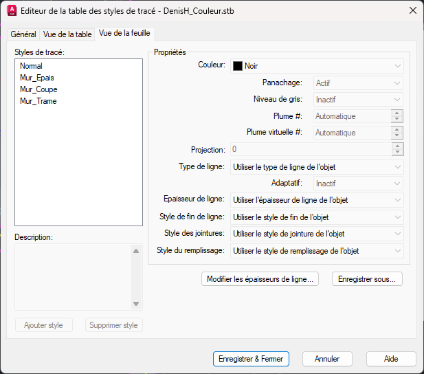 - Exemple : Vous créez un style nommé « Murs_Coupes ». Vous l’appliquez au calque des murs. Peu importe que le calque soit bleu, vert ou rose à l’écran, il s’imprimera avec les paramètres définis dans le style « Murs_Coupes ».