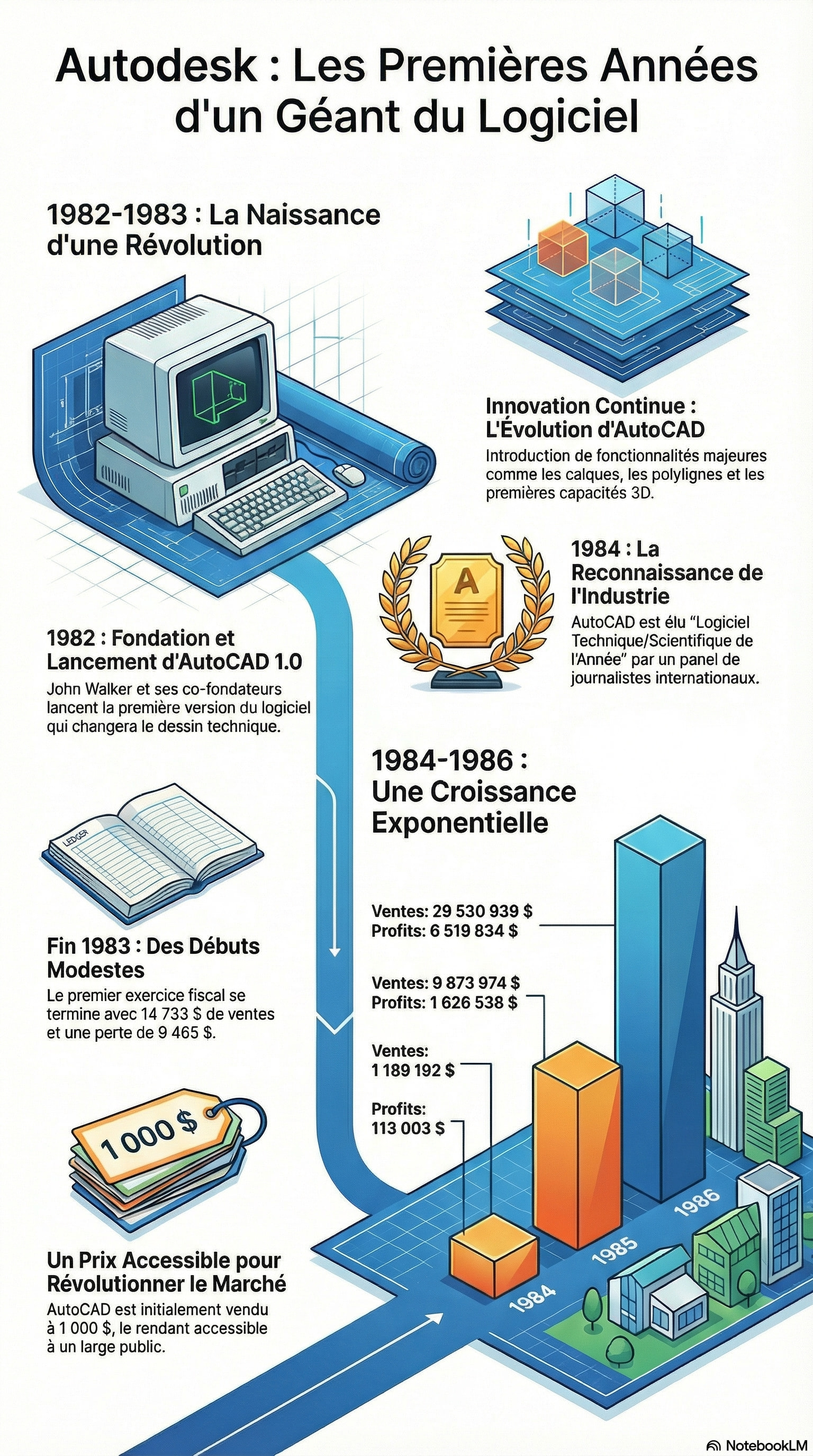 - 1983 (Janvier 31): Fin de l’exercice fiscal 1983 (FY 83). Autodesk® enregistre des ventes de 14 733 $ et une perte de 9 465 $.