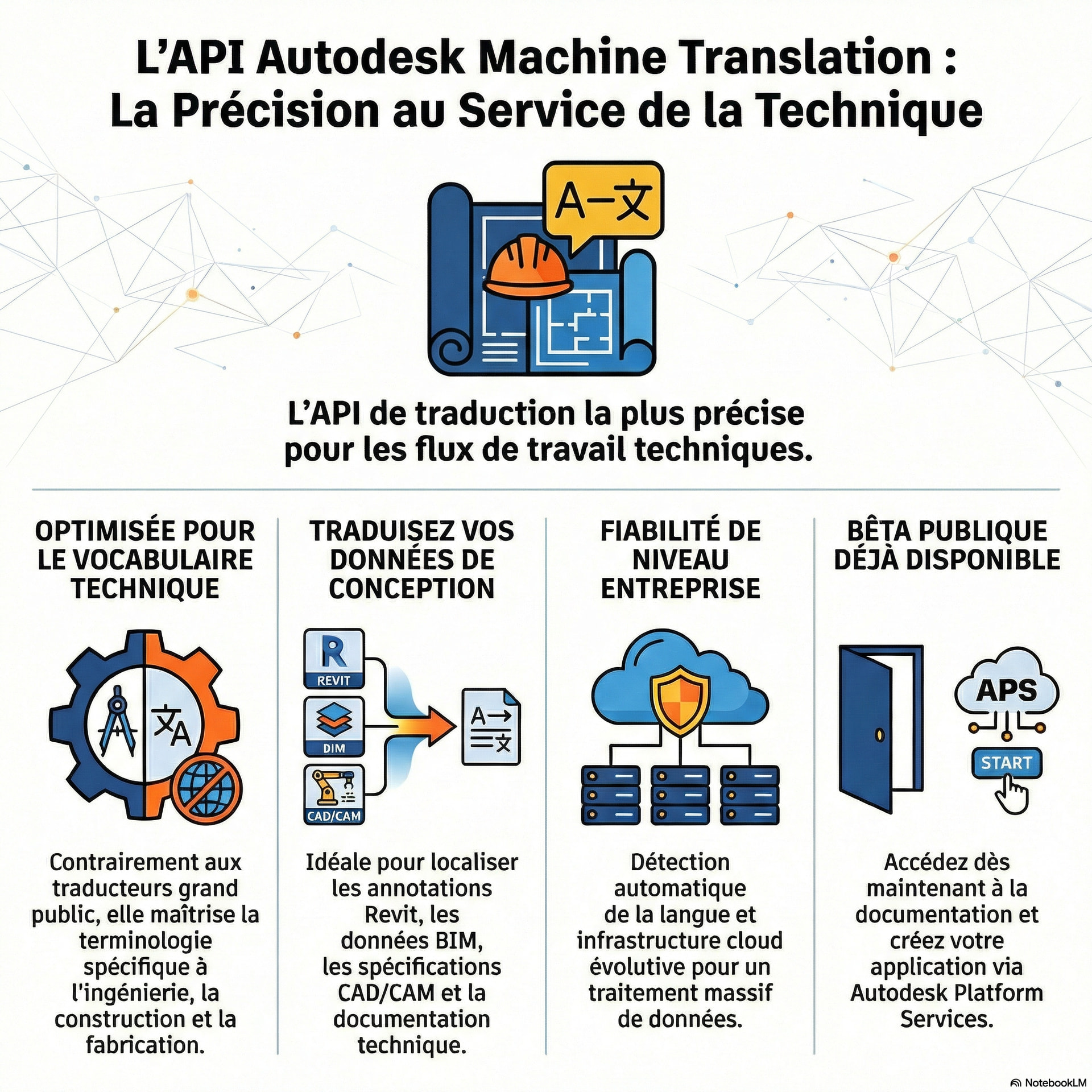 Le futur de la conception et de la fabrication est intrinsèquement mondial, mais la langue demeure souvent l’ultime frontière au sein des flux de travail collaboratifs. C’est pour briser cette barrière qu’Autodesk® annonce l’entrée en phase Public Beta de son API Machine Translation. Ce service cloud offre un accès programmatique au moteur de traduction propriétaire d’Autodesk®, celui-là même qui propulse déjà l’Assistant Autodesk® et nos forums communautaires, garantissant une synergie totale avec l’écosystème APS (Autodesk® Platform Services).