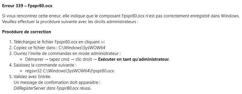 Dans le fichier d’installation du logiciel Bordereau , il manque un composant au nom de « Fpspr80.ocx ». Ci joint la procédure (voir pièce jointe), avec bien évidemment le fichier en question à télécharger en amont.