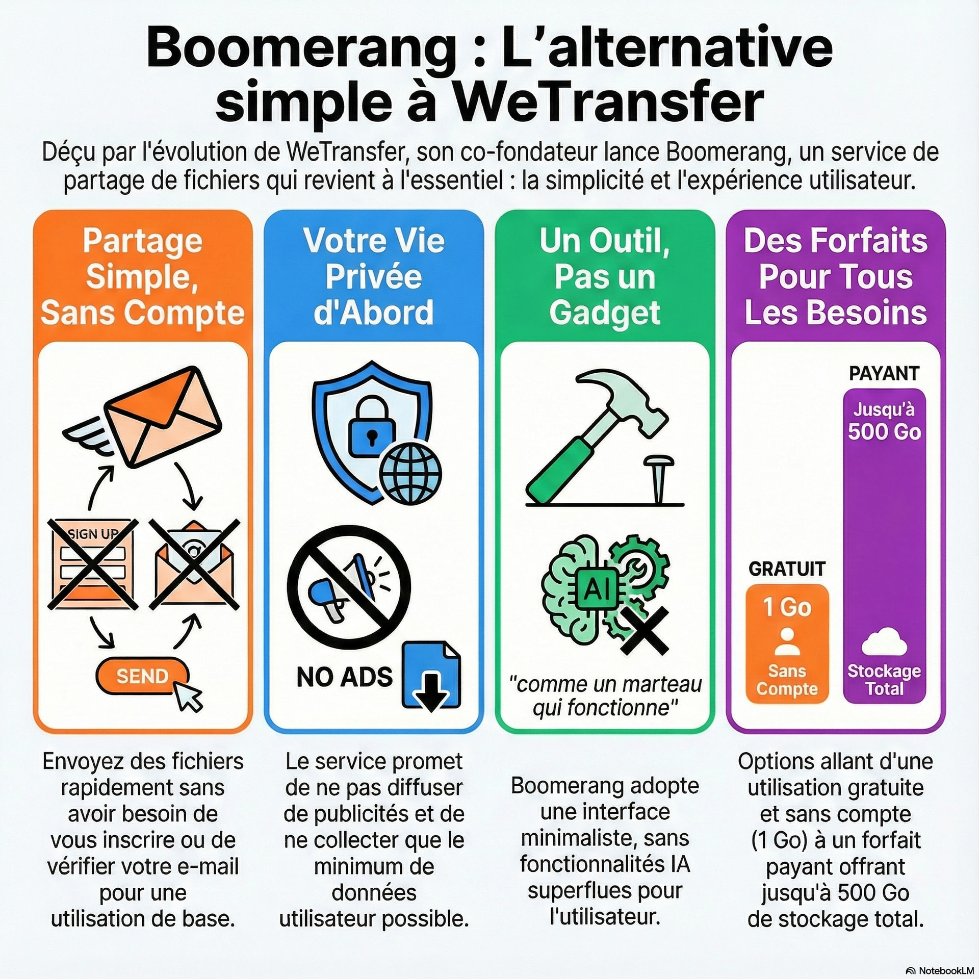 Boomerang est un nouveau service de partage de fichiers lancé par Nalden, l’un des créateurs originaux de WeTransfer. Ce dernier exprime son mécontentement face à la dérive commerciale et à la complexité croissante de son ancienne plateforme après son rachat par une société de technologie. Pour se distinguer, sa nouvelle initiative privilégie une simplicité radicale en permettant l’envoi de documents sans inscription obligatoire ni publicité. Le modèle économique de Boomerang propose des paliers de stockage gratuits et payants tout en garantissant la protection des données. En refusant d’intégrer des fonctions d’intelligence artificielle superflues, l’entrepreneur cherche à restaurer une expérience utilisateur fluide et efficace.