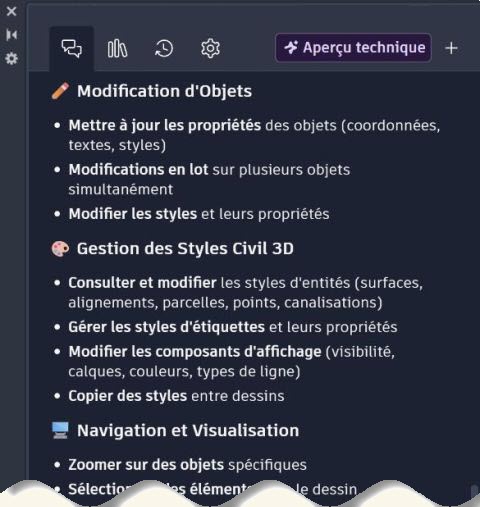 Il semble au vu des premières informations que Civil 3D 2027 soit beaucoup plus capable d’agir sur le dessin avec son assistant qu’AutoCAD 2027.