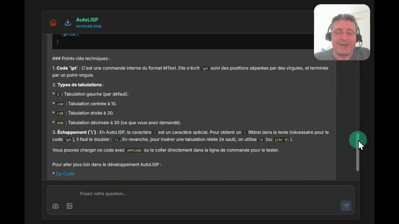 En complément, j’expliquais ci-dessus comment générer une petite routine AutoLISP avec l’intelligence artificielle Google Gemini 3 Pro. J’en profite pour signaler et vous montrer une démonstration de mon assistant expert AutoCAD basé sur l’intelligence artificielle qui est disponible soit à tout le monde en plan gratuit avec des limitations, soit à mes abonnés Patreon payant sans limitation. Et voici donc ci-dessous un exemple de ce que cet assistant peut générer comme routine Lisp avec le plan payant: