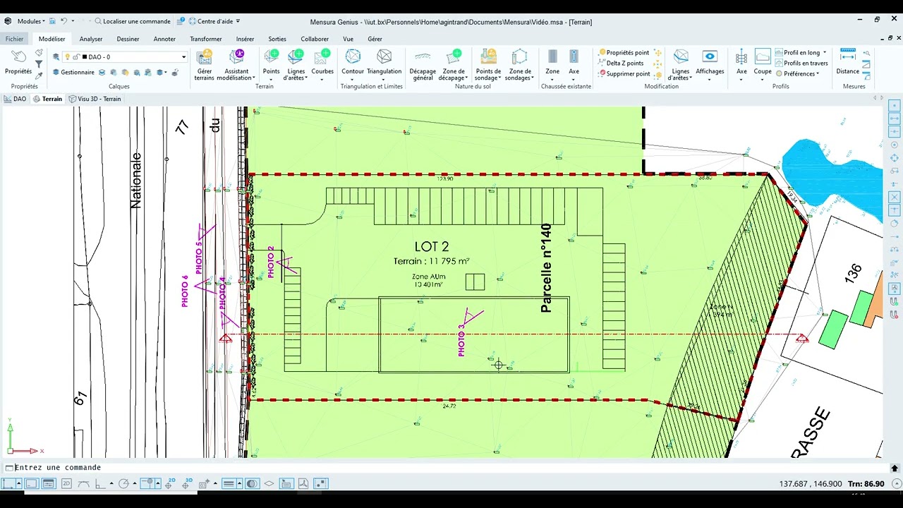 La vidéo « Mensura 3 - Décapage terre végétale » explique comment paramétrer le décapage de la terre végétale dans le logiciel Mensura. Initialement, le formateur montre une option de décapage général, mais souligne son manque de pertinence pour des zones spécifiques. Il détaille ensuite la procédure pour définir une zone de décapage précise en utilisant des polylignes provenant d’un fichier DAO, comme le contour d’un bâtiment. La vidéo met en évidence l’importance d’utiliser la fonction de décalage pour étendre la zone de décapage au-delà des limites initiales et de créer des points spécifiques le long de cette polyligne décalée pour définir précisément la zone dans le module terrain. Enfin, elle illustre comment appliquer un décapage d’une profondeur donnée, par exemple 20 cm, à cette zone nouvellement définie.