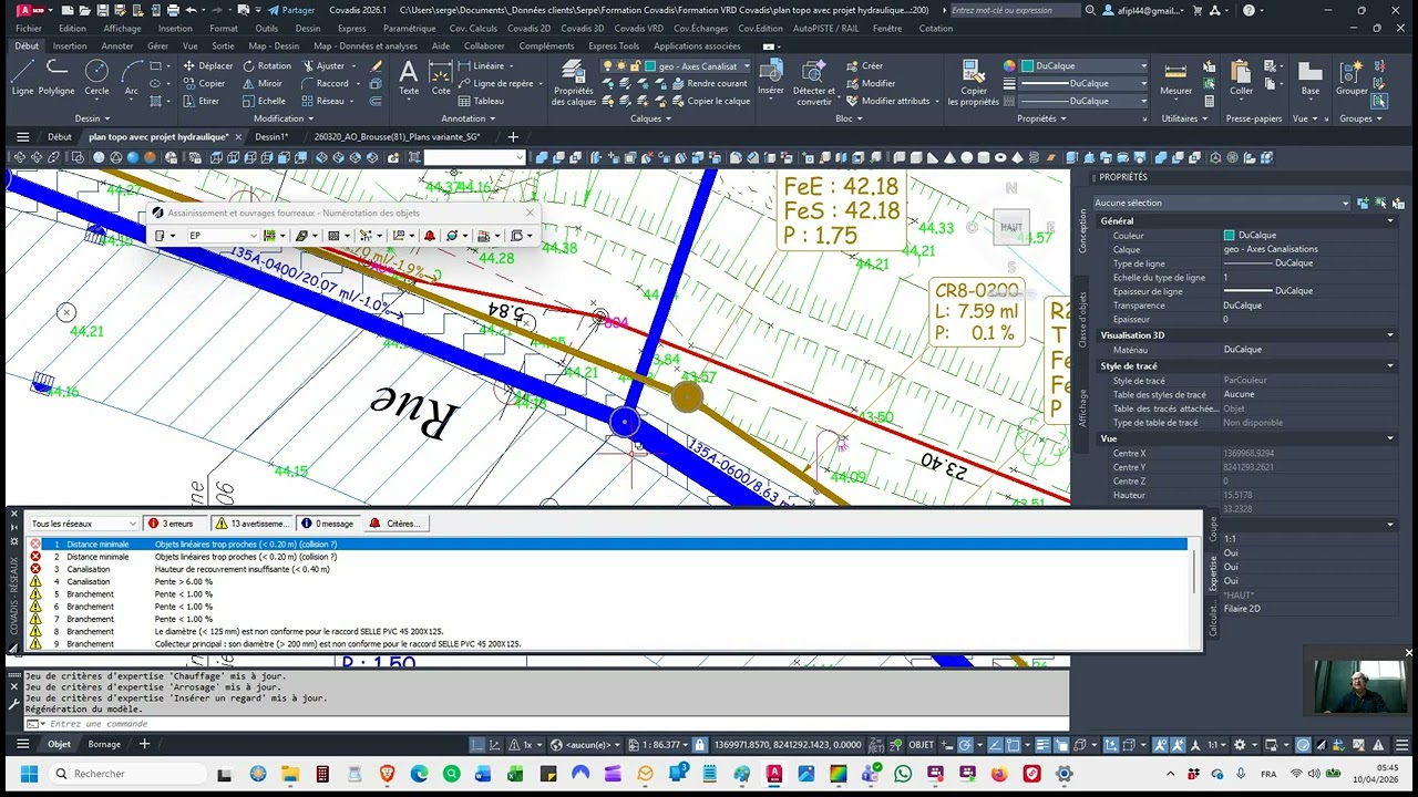 Contrôle d'un projet de canalisation Covadis avec le module Assainissement et ouvrages fourreaux