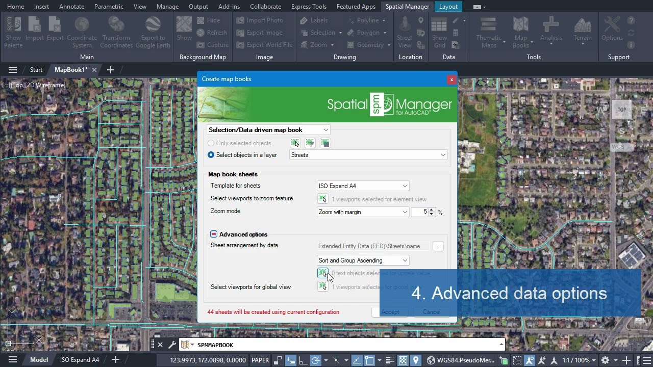 L’objectif principal de l’extrait de blog est d’expliquer la fonction « Create Map Books » , un outil avancé pour la production de documents d’impression ou de partage de projets de conception. Un « map book » est défini comme un ensemble de mises en page dont les fenêtres sont ajustées automatiquement en fonction des objets regroupés par des valeurs spécifiques dans leurs données associées. Les étapes détaillées décrivent l’utilisation de la commande SPMMAPBOOK , qui permet aux utilisateurs de sélectionner des objets, de choisir un modèle et d’appliquer des options de zoom. La fonctionnalité essentielle réside dans les options de données avancées permettant d’organiser les feuilles par champ de données pour créer une mise en page distincte pour chaque valeur unique. Cette documentation est classée comme un niveau avancé (CAD L3) , signalant son usage pour des tâches d’impression cartographique complexes.
