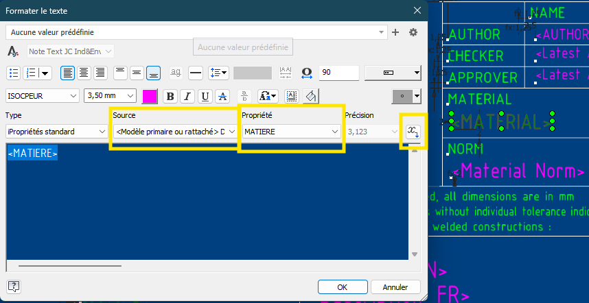 Tout d’abord il est bien sur possible d’importer le cartouche à partir d’un dwg, mais seul les dessins sont idéal à récupérer. Tout ce qui est du texte avec ipropriété doit être recréer. Avec inventor si vous voulez que le cartouche soit rempli automatiquement vous devez ajouter les propriétés pour chaque champs. Vous pouvez m’envoyer un exemple de votre dwg et je peux regarder, Le logo entreprise est-il du dessin ou une photo? Quels informations voulez vous récupérer? Description, poids, numéro de documents, … Toutes ses propriétés doivent en faites être récupérer de votre 3D, ipt, iam et ipn. Danny