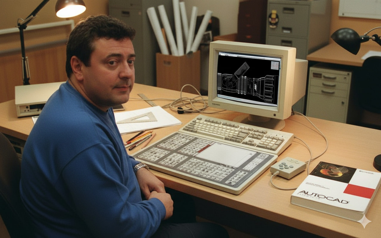 Voici donc ci-dessous une photographie, si j’ose dire, qui n’a jamais existé, de moi-même travaillant apparemment sur une version AutoCAD® 12 avec un numériseur et puis un manuel AutoCAD® version 12 posé à côté de moi.