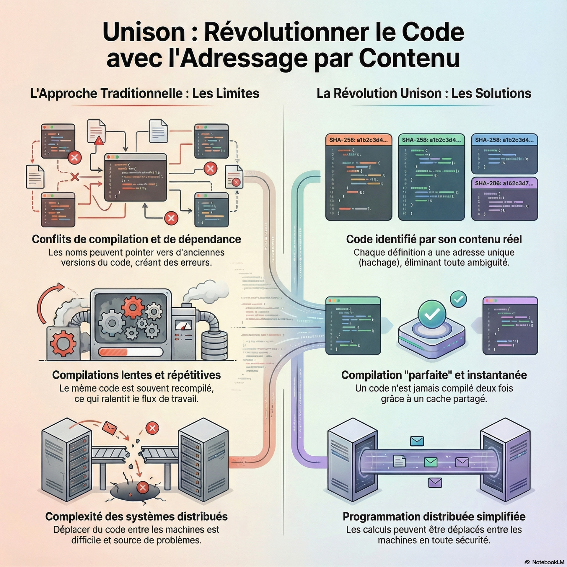 Unison adopte une approche différente : le code est immuable et identifié par son contenu.