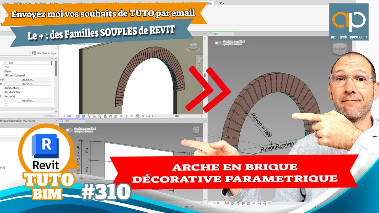 Je montre comment créer dans Revit® une famille paramétrique d’arc décoratif en utilisant des familles génériques adaptatives métriques. Dans ce tutoriel, j’explique pas à pas la réalisation d’un arc en briques dont la largeur, l’épaisseur, la hauteur et le matériau peuvent être facilement modifiés grâce à des paramètres.