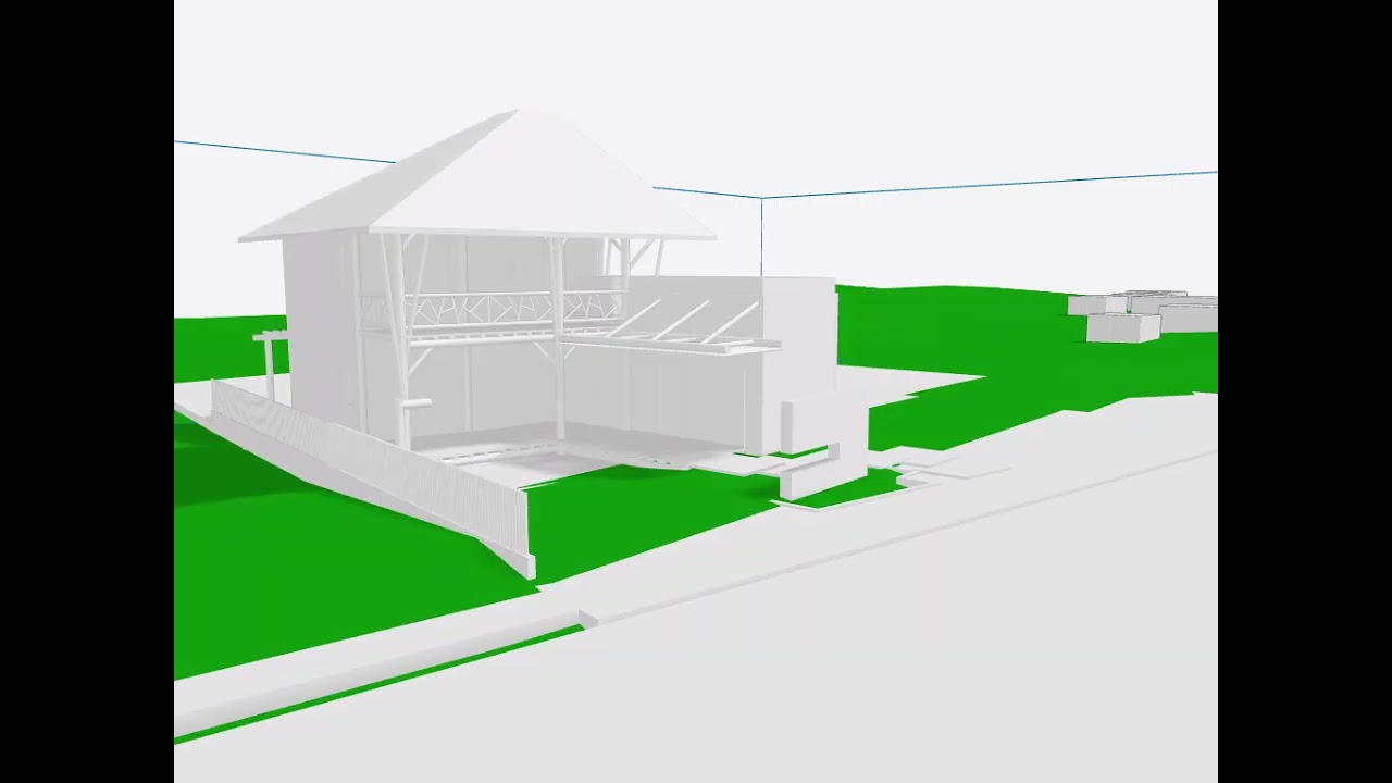 Mon but était surtout de voir si la petite piscine, qu’on ne voit pas sur l’illustration, mais qui est située au premier plan entre les 2 branches de la forme en L de la maison sera éclairée et pendant combien de temps, de façon que l’eau soit suffisamment chauffée. Donc ça paraît assez concluant ici, c’est une animation pour le 21 juin du matin au soir, nous sommes quasiment à l’Équateur à moins 4° de latitude sud, donc le soleil est quasiment au Zénith à 12h00. On voit que la zone à l’avant plan de la maison est effectivement éclairée. Grosso modo de 10h00 du matin à 15h00, ce qui est très bien. On voit aussi ce qui était prévu que le toit protège les terrasses et les balcons du soleil. Seule la terrasse à droite de la maison, le rooftop, lui, n’est pas protégé, est une terrasse ouverte, ce qui était prévu. La maison du voisin en cours de construction à gauche de la scène n’est pas représentée, mais elle devrait cacher le Soleil seulement tôt le matin donc c’est pas gênant.