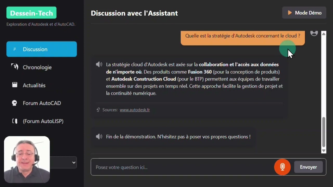 Bonjour, je vous présente aujourd’hui une application réalisée à l’aide de l’intelligence artificielle qui vous permettra d’explorer le monde Autodesk®, l’histoire de la société en particulier le monde AutoCAD®, le logiciel, ses fonctionnalités et la programmation Autolisp.