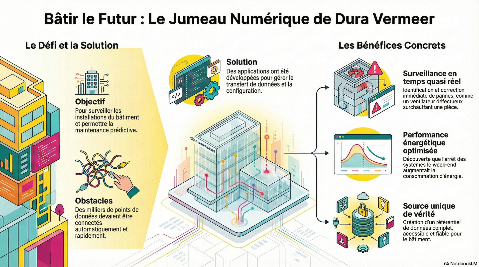 Le texte explore comment Dura Vermeer, une entreprise de construction néerlandaise, a mis en œuvre des jumeaux numériques pour améliorer la gestion de ses bâtiments. En utilisant Autodesk® Tandem et Azure, ils ont pu connecter des données en temps quasi réel provenant de leurs installations à leurs modèles BIM (Building Information Modeling). Ce projet visait à optimiser les performances des bâtiments, à permettre la surveillance continue et la maintenance prédictive, et à créer une source unique de vérité pour toutes les informations du bâtiment. Le processus a rencontré des défis liés au stockage et à l’intégration des données, mais a finalement permis à Dura Vermeer d’obtenir des informations précieuses et d’améliorer l’efficacité opérationnelle de leur centre d’inspiration.