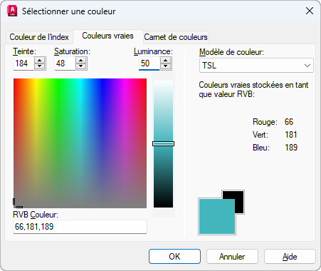 - COULEUR (COLOR) : Ouvre la boîte de dialogue de sélection et définit la couleur courante pour les nouveaux objets (Attention : il est recommandé de laisser ceci sur « DuCalque »).