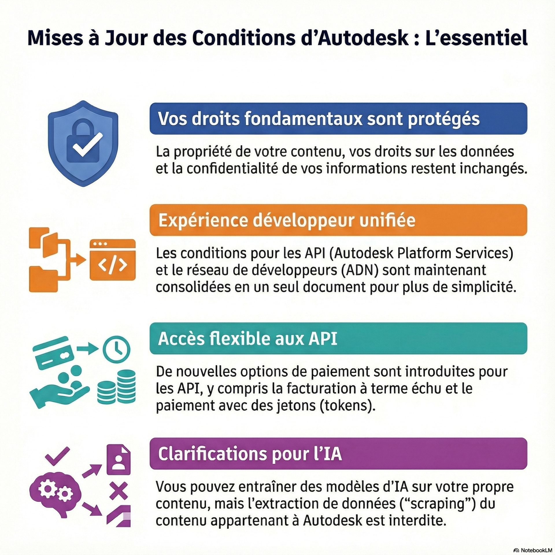 Vous venez de voir qu’Autodesk® a mis à jour ses conditions d’utilisation et vous vous demandez ce que cela signifie pour vous ? Pas d’inquiétude. Ce document est conçu pour traduire le « jargon juridique » en informations claires et concrètes. Ces ajustements ne sont pas de simples formalités ; ils préparent le terrain pour l’avenir des services Autodesk®, notamment en ce qui concerne l’automatisation par l’IA et de nouvelles manières de créer. Notre objectif est de vous aider à comprendre ce qui change (et ce qui ne change pas), afin que vous puissiez continuer à créer en toute confiance.