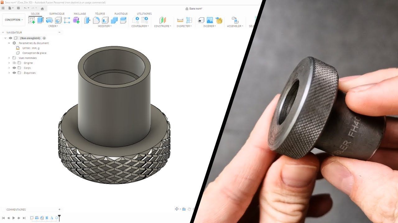 Cette vidéo pédagogique détaille la méthode pour modéliser une pièce mécanique cylindrique à l’aide du logiciel Fusion®. Le tutoriel commence par la création d’une esquisse profilée et l’application de contraintes géométriques pour réaliser une révolution 3D précise. L’élément central de la démonstration explique comment concevoir un moletage personnalisé en utilisant l’outil spire, faute de fonction automatisée dans le programme. L’auteur complète ensuite le relief en appliquant des symétries miroirs et des réseaux circulaires pour répéter le motif sur toute la surface. Enfin, l’ajout de chanfreins finalise l’objet, tout en offrant aux spectateurs un plan technique pour s’exercer en autonomie.