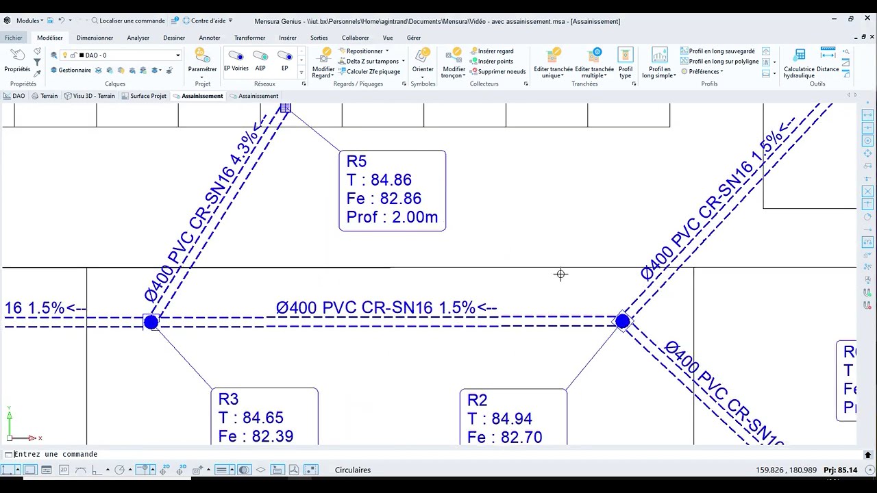 La vidéo « Mensura 8 - Modification d’un réseau d’assainissement » présente une démonstration logicielle sur la modification d’un réseau d’assainissement. L’objectif est de montrer comment ajuster des paramètres tels que la pente des collecteurs et la profondeur des regards, ainsi que la personnalisation d’éléments comme l’ajout d’une grille spécifique ou d’une hauteur de décantation. Le tutoriel met en évidence l’importance de tracer un profil en long pour identifier les problèmes de conception et optimiser le réseau pour la cohérence. Il explique comment le logiciel recalcule automatiquement les profondeurs après un changement de pente, et comment gérer la base de données pour ajouter de nouveaux composants. Enfin, la vidéo montre la rotation des grilles pour un alignement visuel plus précis.