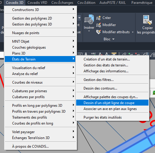 Pour voir les bordures en coupe, on peut utiliser l’objet ligne de coupe disponible dans « Covadis®3D » puis « Etats de terrain » puis « Dessin d’un objet ligne de coupe ».