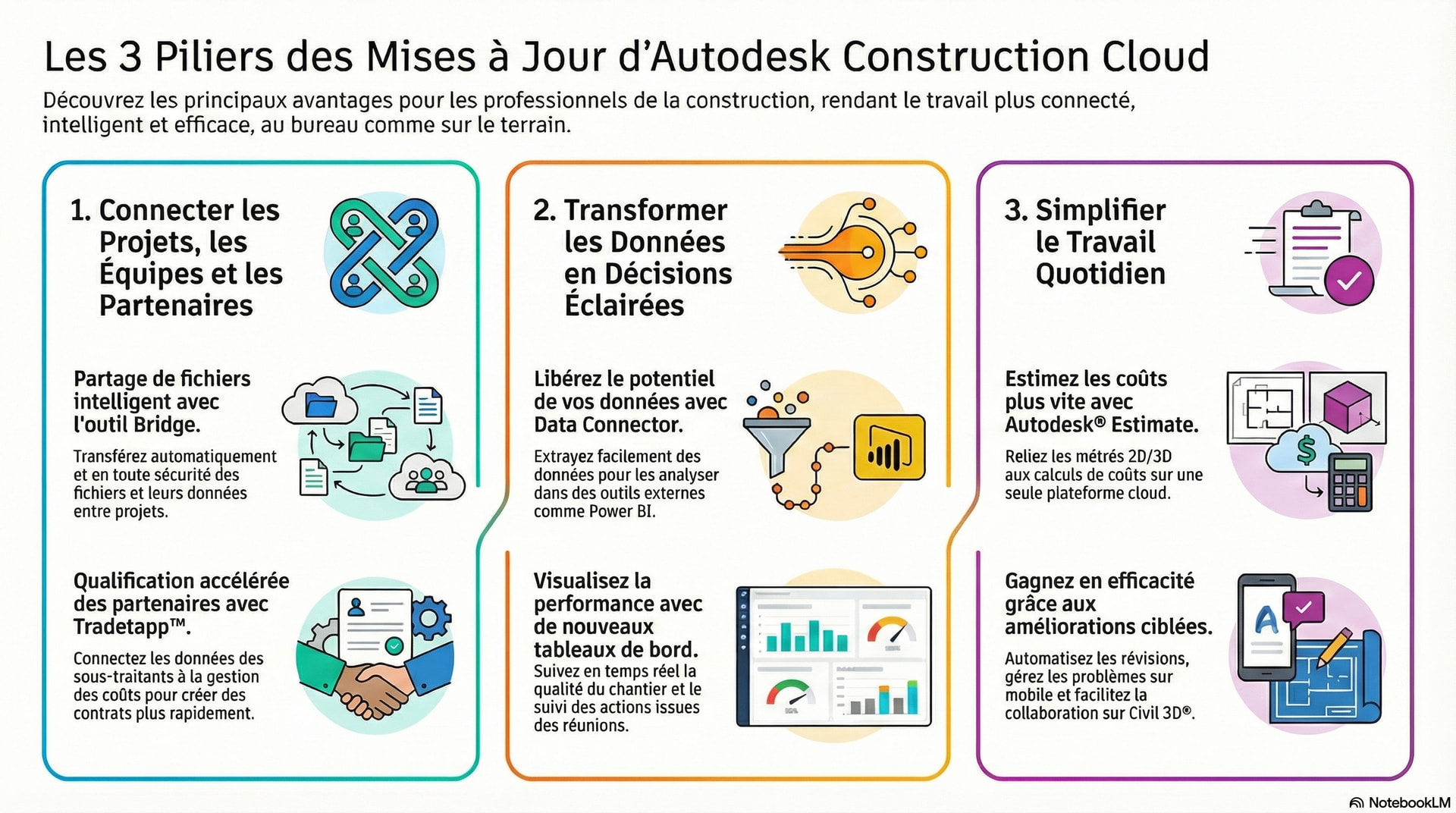 Bienvenue dans le monde de la construction numérique ! Si vous êtes étudiant ou que vous débutez dans le domaine, la technologie peut parfois sembler complexe. Ce guide est conçu pour vous. Son but est de démystifier les dernières mises à jour d’Autodesk® Construction Cloud en se concentrant sur les avantages pratiques plutôt que sur le jargon technique. Nous verrons comment ces outils rendent la gestion de projet plus connectée en reliant les équipes, plus intelligente en transformant les données en décisions, et plus efficace en simplifiant le travail de chacun.