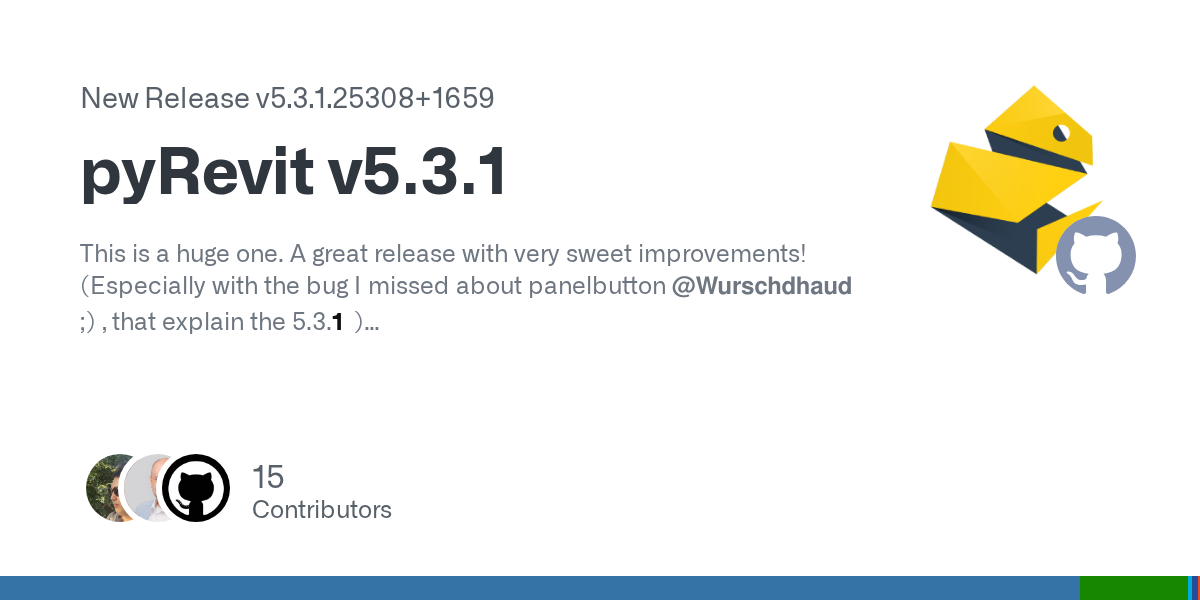 La version pyRevit v5.3.1 est décrite comme une version majeure (« a huge one ») et une « excellente version avec de très belles améliorations » (« a great release with very sweet improvements! »).