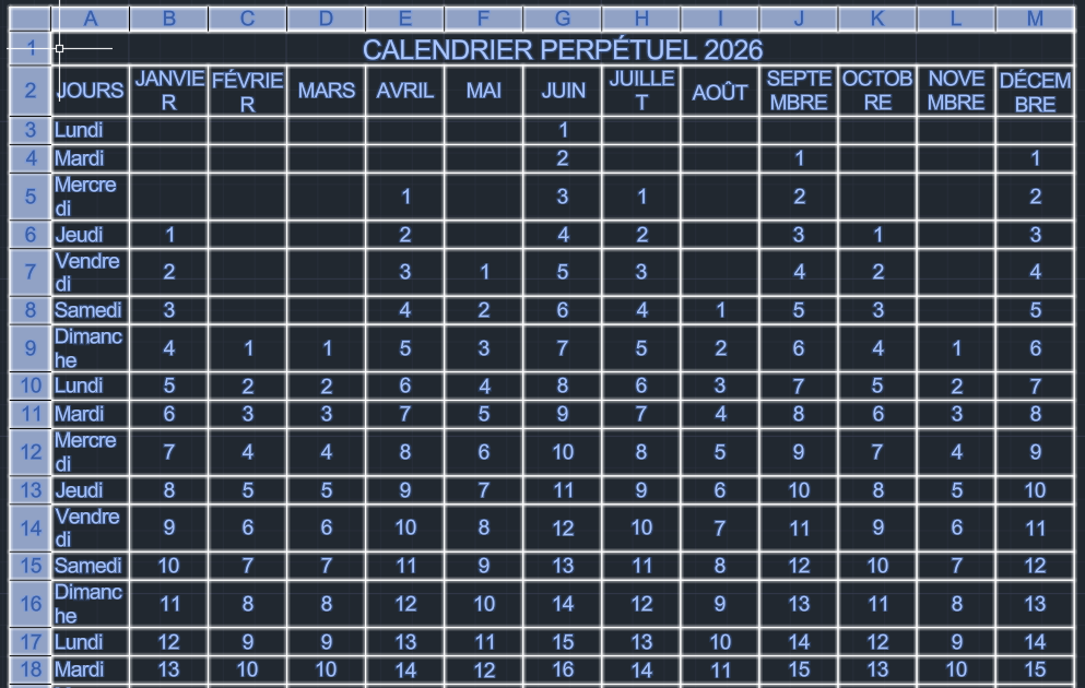 Voilà donc ci-dessous le résultat partiel d’une copie d’écran du calendrier pour l’année 2026. Inutile de dire, et vous l’avez certainement vu au premier coup d’œil, que ce programme est très perfectible. Largeur de colonnes, affichage des numéros de jour, aux intersections, enfin des petites améliorations qu’on pourrait faire sans doute très facilement. Mais ce qui m’intéressait de voir, c’est le principe général de fonctionnement, surtout l’exactitude du calendrier. Je n’ai pas testé ce calendrier pour les années bissextiles, mais Gemini me certifie que ça fonctionnera, à voir, comme dit l’autre. ![]()
