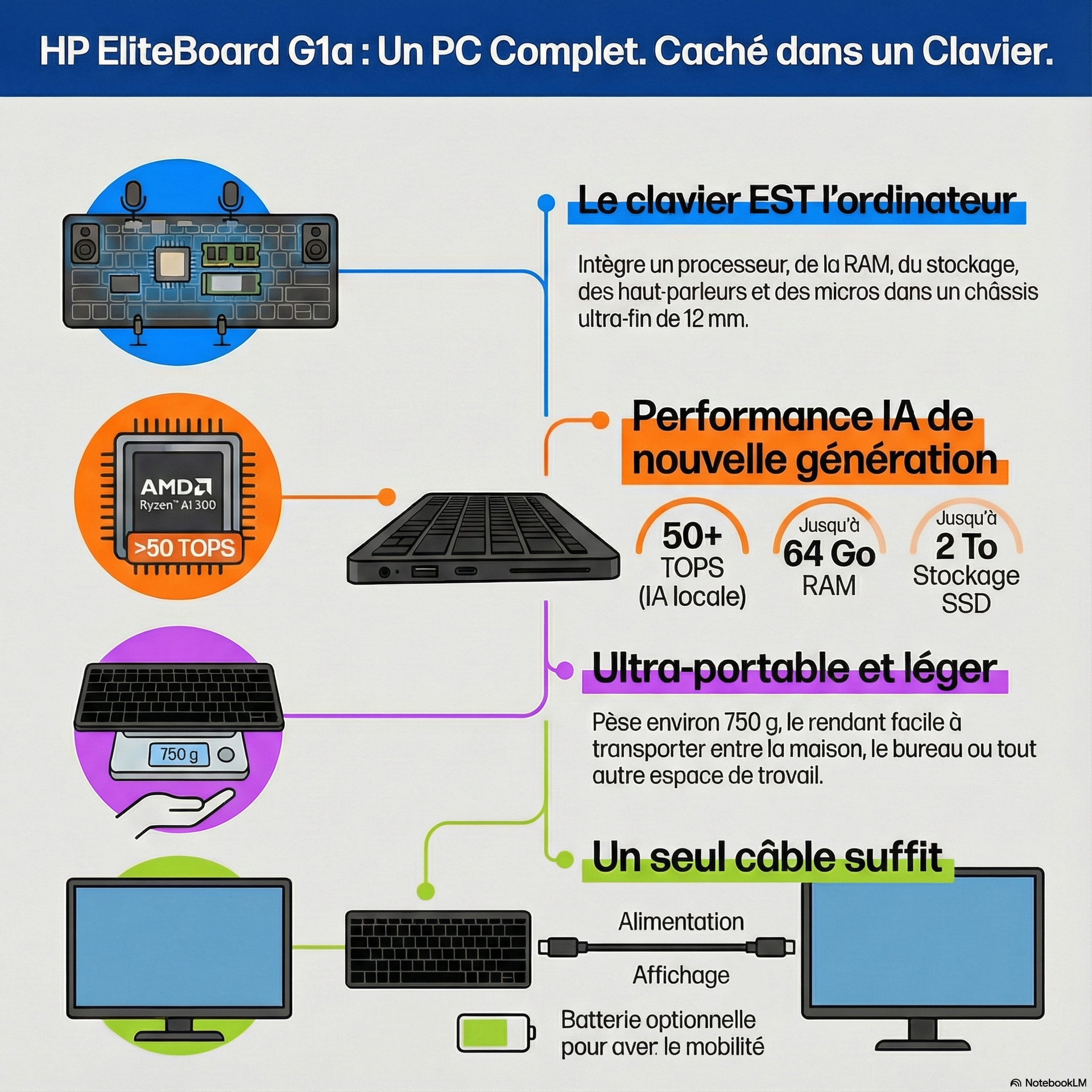 Bienvenue dans l’univers de l’informatique minimaliste ! Le concept d’un « PC dans un clavier » est simple : tous les composants qui font fonctionner un ordinateur (processeur, mémoire, stockage) sont intégrés directement dans le châssis d’un clavier. Cette idée rappelle des ordinateurs historiques comme le Commodore 64, mais elle a été modernisée pour l’entreprise, évoluant au-delà des appareils pour amateurs comme le Raspberry Pi 400. L’HP EliteBoard G1a est conçu pour l’utilisateur professionnel qui travaille souvent avec son ordinateur portable fermé, connecté à un moniteur externe. Il vise à créer un espace de travail simple, épuré et sans encombrement, tout en offrant la puissance d’un PC d’aujourd’hui.
